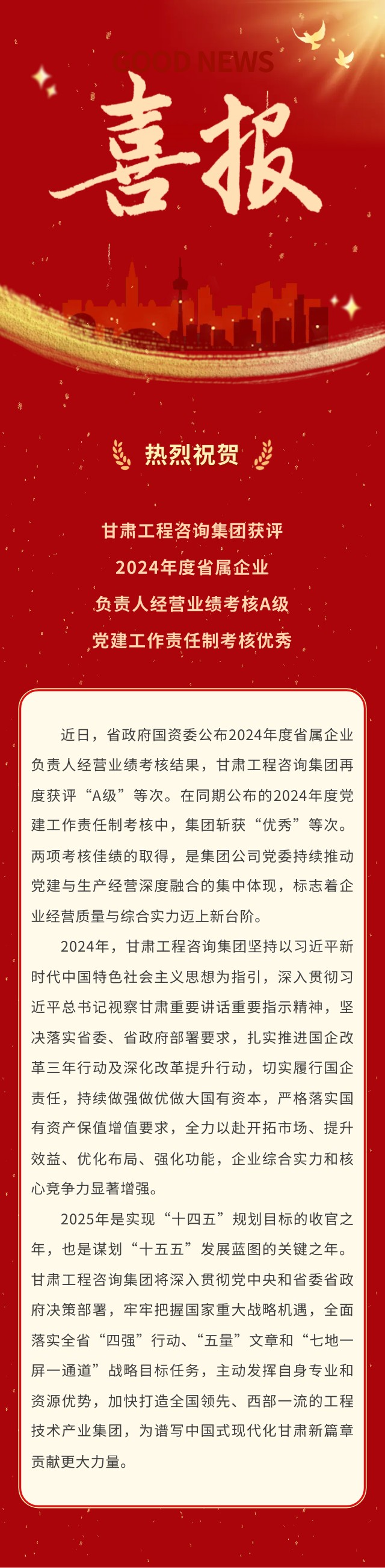 喜報(bào) | 甘肅工程咨詢集團(tuán)榮獲2024年度省屬企業(yè)考核“雙優(yōu)”佳績(jī):經(jīng)營(yíng)業(yè)績(jī)考核A級(jí)、黨建工作責(zé)任制考核優(yōu)秀